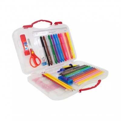 Contiene marcadores y lápices de colores, sacapuntas, goma en barra, lápices negros, tijera, regla.