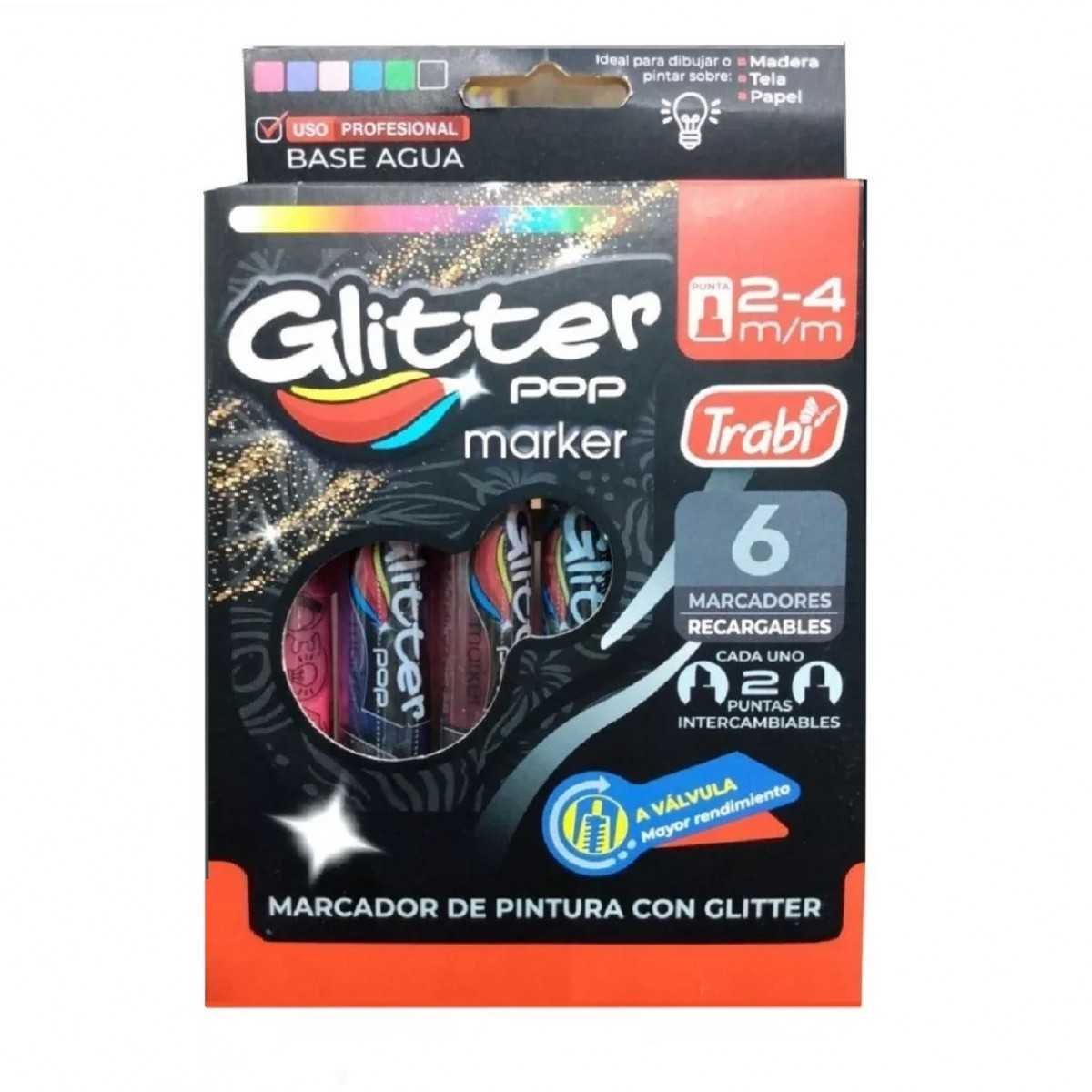 Set de marcadores acrílicos con 2 puntas redonda y biselada de 2-4 mm x 6 colores glitter Trabi